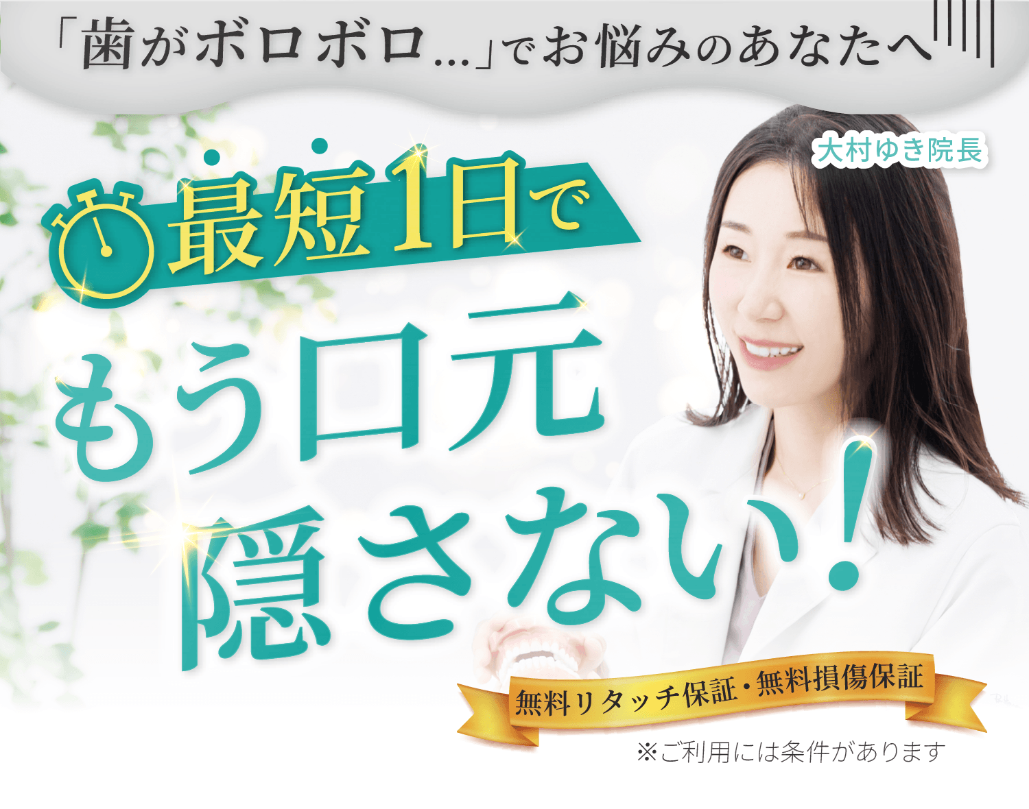 効率的な集中治療を行うことにより、最短1回目の治療ですべての虫歯を治療します。そのため、初回で白くキレイな仮歯(プラスチック製)を被せることが可能です。最短1日で、痛みともボロボロの歯ともお別れし、元の笑顔を取り戻すことができます。